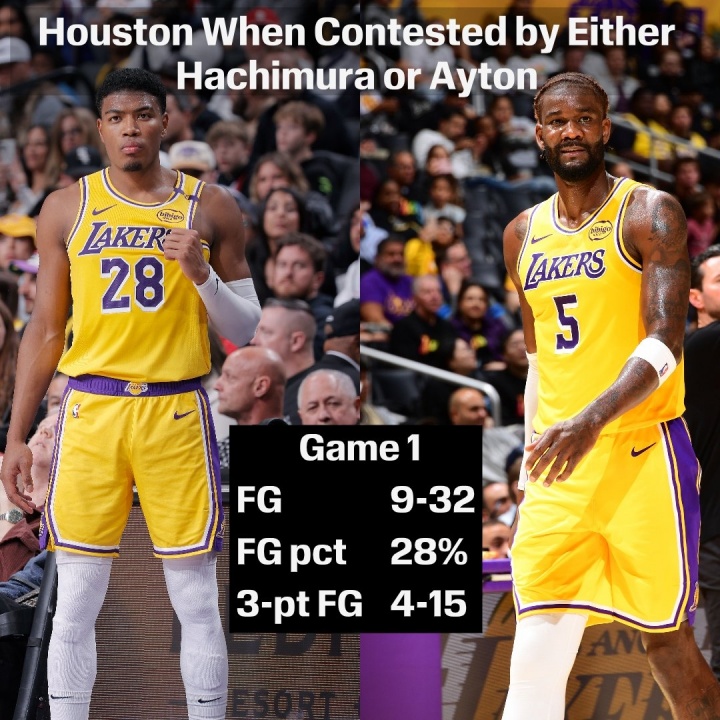 本场比赛,八村塁和艾顿的防守在线,在二人的防守下,火箭球员合计32投9中,命中率仅为28%,三分为15中4。